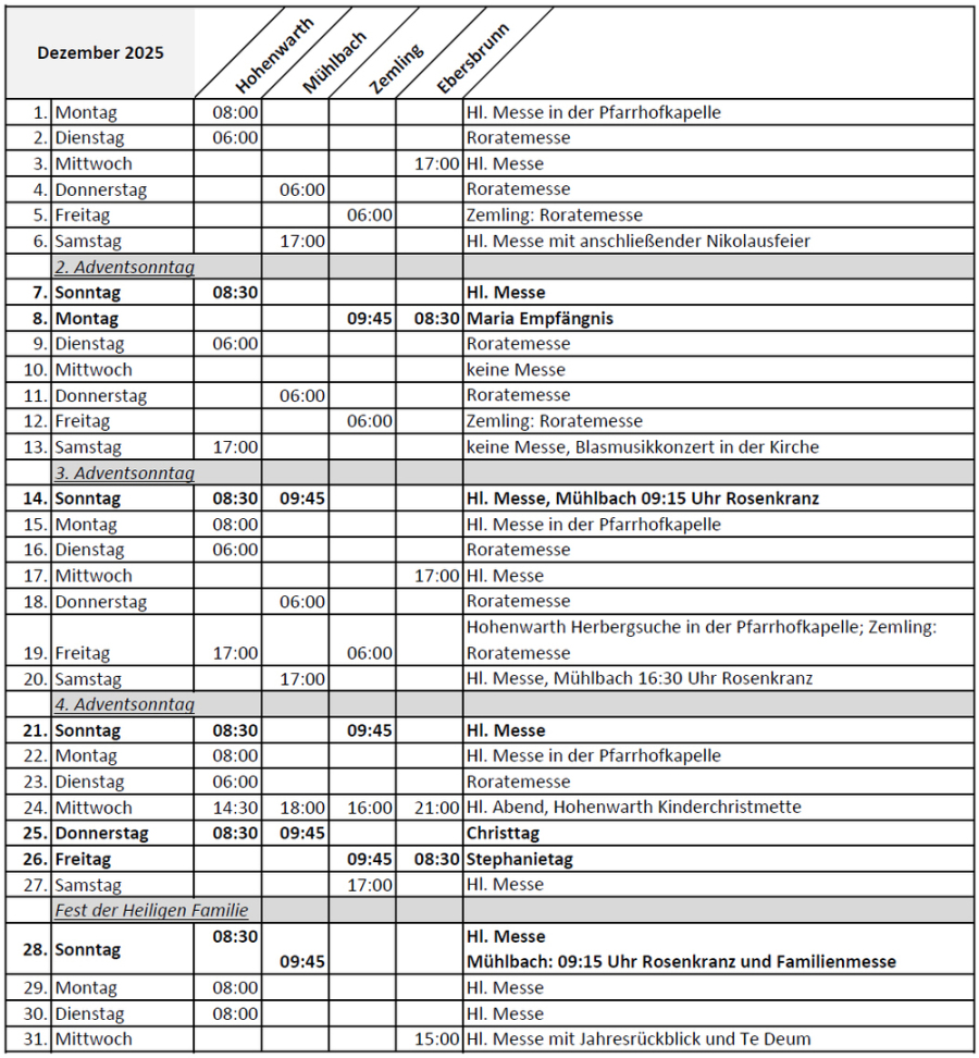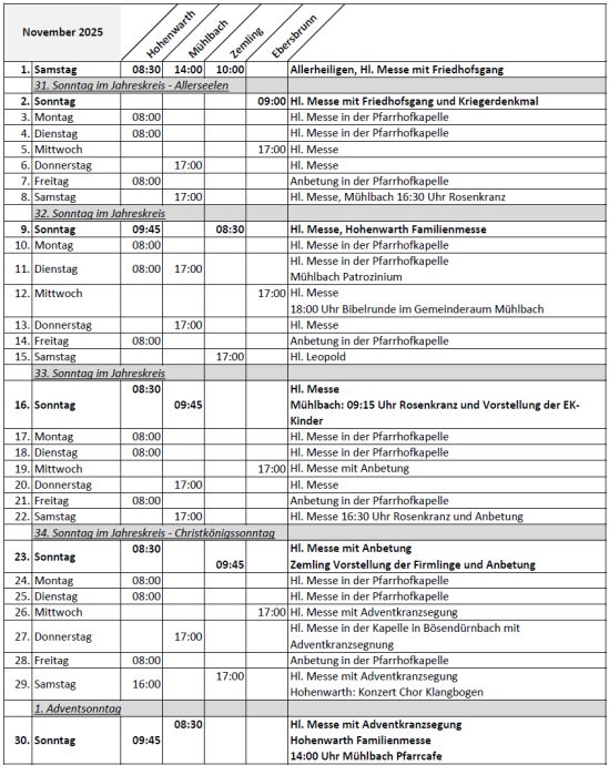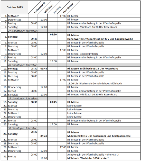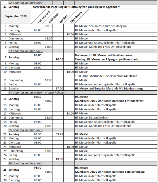 Gottesdienste Hohenwarth September 2025 bis Dezember 2025